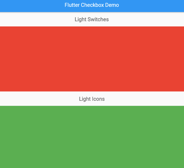 Since this main layout of our app is vertical, we’ll use a column to create it. Therefore, replace the body of our home page Scaffold with a column. The column has four children. The first is a container for the top section header that displays the header text Light Switches. The second is the area where the light switches will go. For now, we’ve inserted a placeholder container with a red background. The third child is a container for the bottom section header that displays the text Light Icons. Finally, the fourth child is the area where the visual representation of the room lights will go. For now, we have inserted a placeholder container with a green background.
