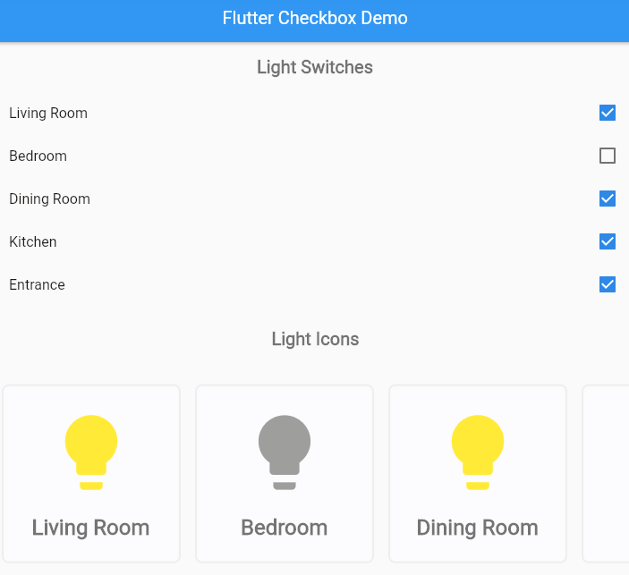 ...Notice in the code snippet above that when we define the CheckboxListTile, we pull in the value of the Living Room light switch from the lightSwitches state variable we defined earlier.