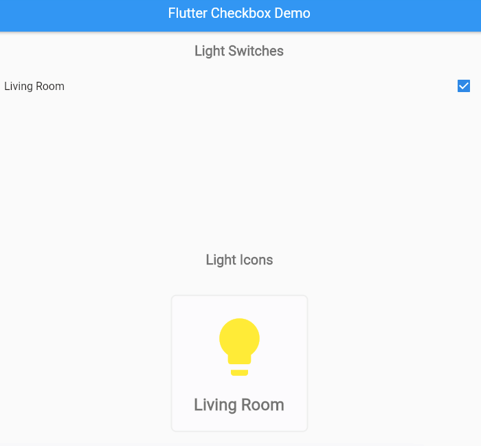 Also, note that we’ve provided a callback to the onChanged property of the CheckboxListTile. The callback updates the on/off value of the Living Room light when the checkbox is tapped, and it causes the checkbox to rebuild to reflect its new state.