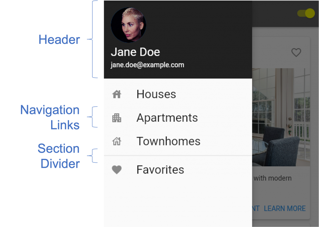 Drawers will typically include a header, a collection of navigation links, and section dividers to separate groups of links. See the image below for an illustration of this layout.