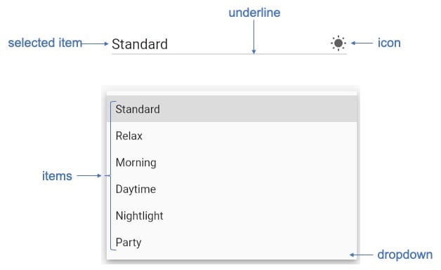 Visually, a DropdownButton comprises five overall components: selected item, icon, underline, dropdown, and items. See the diagram below for a visual representation of these components.
