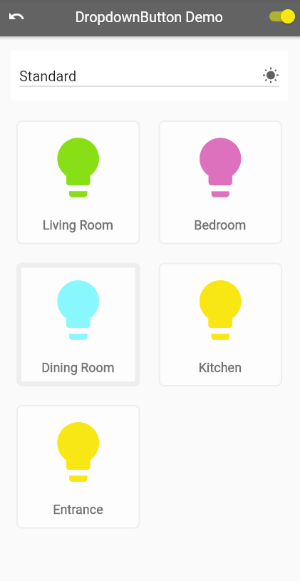 Next, we display the icons of light bulbs in a GridView. Paste the code below into the _MyHomePageState build function. You can now run the app and adjust the lights for each room. We don’t yet have the ability to switch between different light scenes, but we have all the infrastructure in place. Later, in Step 6, we’ll enable this new feature by adding the DropdownButton to the app to control switching between different scenes.